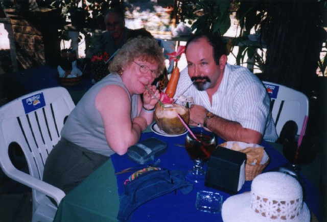 Rosemerry and Roger enjoying a coconut drink. A drink served in a fresh coconut,